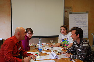 Acht Führungskräfte und Mitarbeiter/innen aus den Altenpflegeheimen St. Hedwig und St. Michael befassten sich in der ganztägigen Veranstaltung mit der Personalgewinnung in der Altenpflege. Roswitha Lemme, Koordinatorin Altenhilfe des Caritasverbandes, und Dr. Jürgen Zieher, wissenschaftlicher Mitarbeiter im Team BEST WSG, moderierten – wie schon beim Auftaktworkshop im März – gemeinsam das Programm.